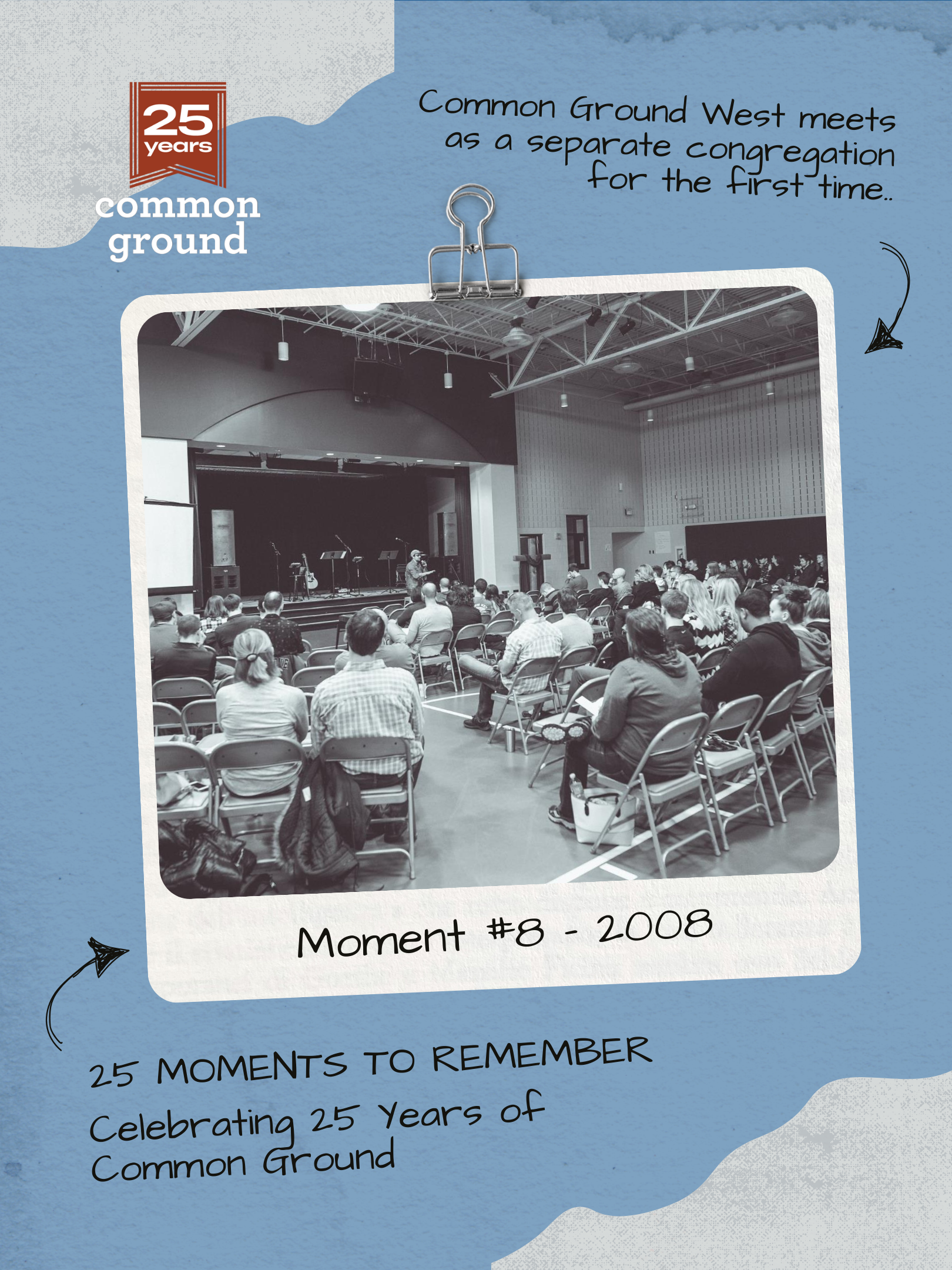 Moment #8 Graphic - Next in our 25 Moments to Remember series, we’re marking 2008, when Common Ground West met as a separate congregation for the first time.