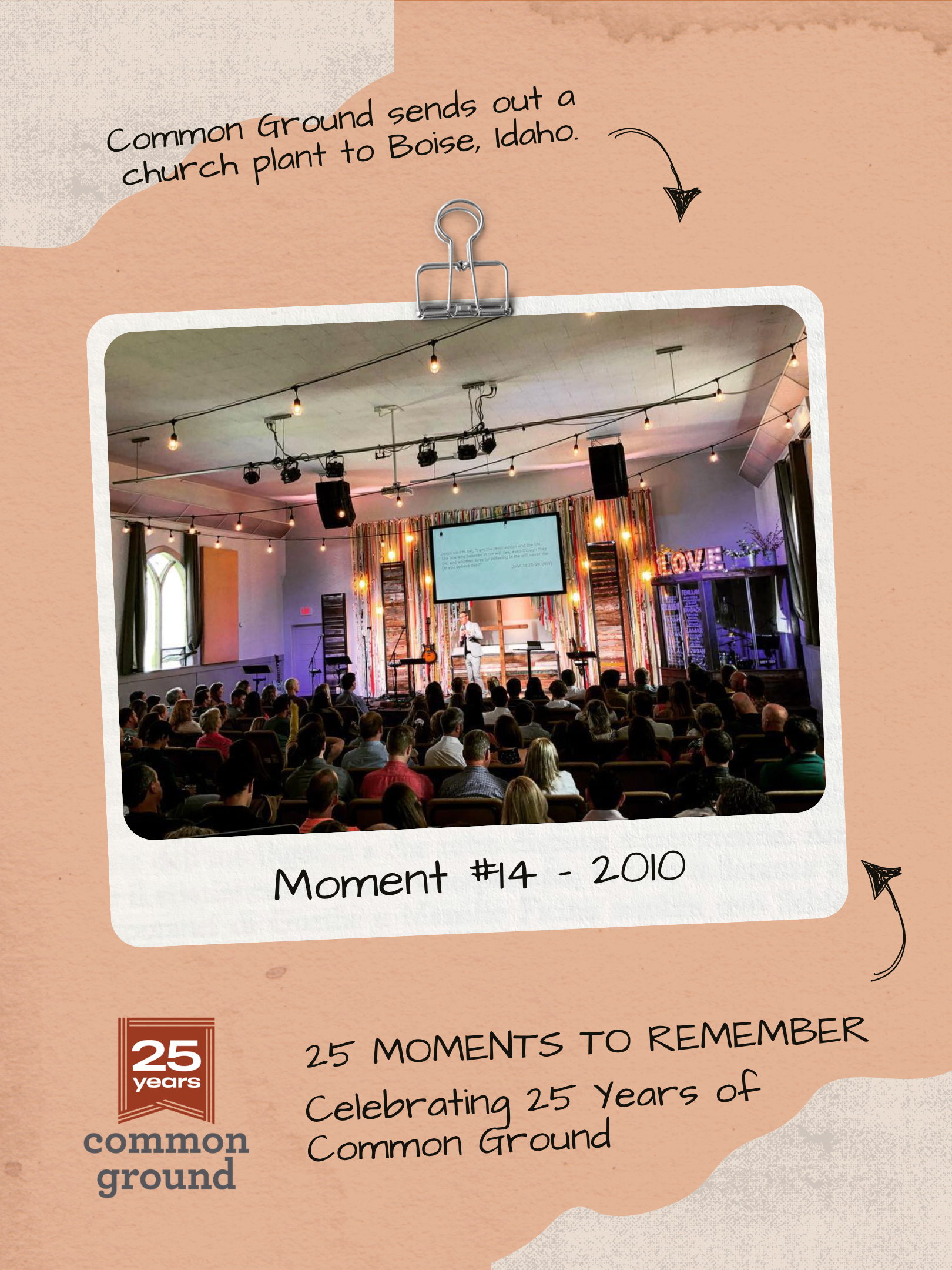 Moment #14 Graphic - Next in our 25 Moments to Remember series, we’re highlighting when Common Ground helped plant a church in Boise, Idaho.