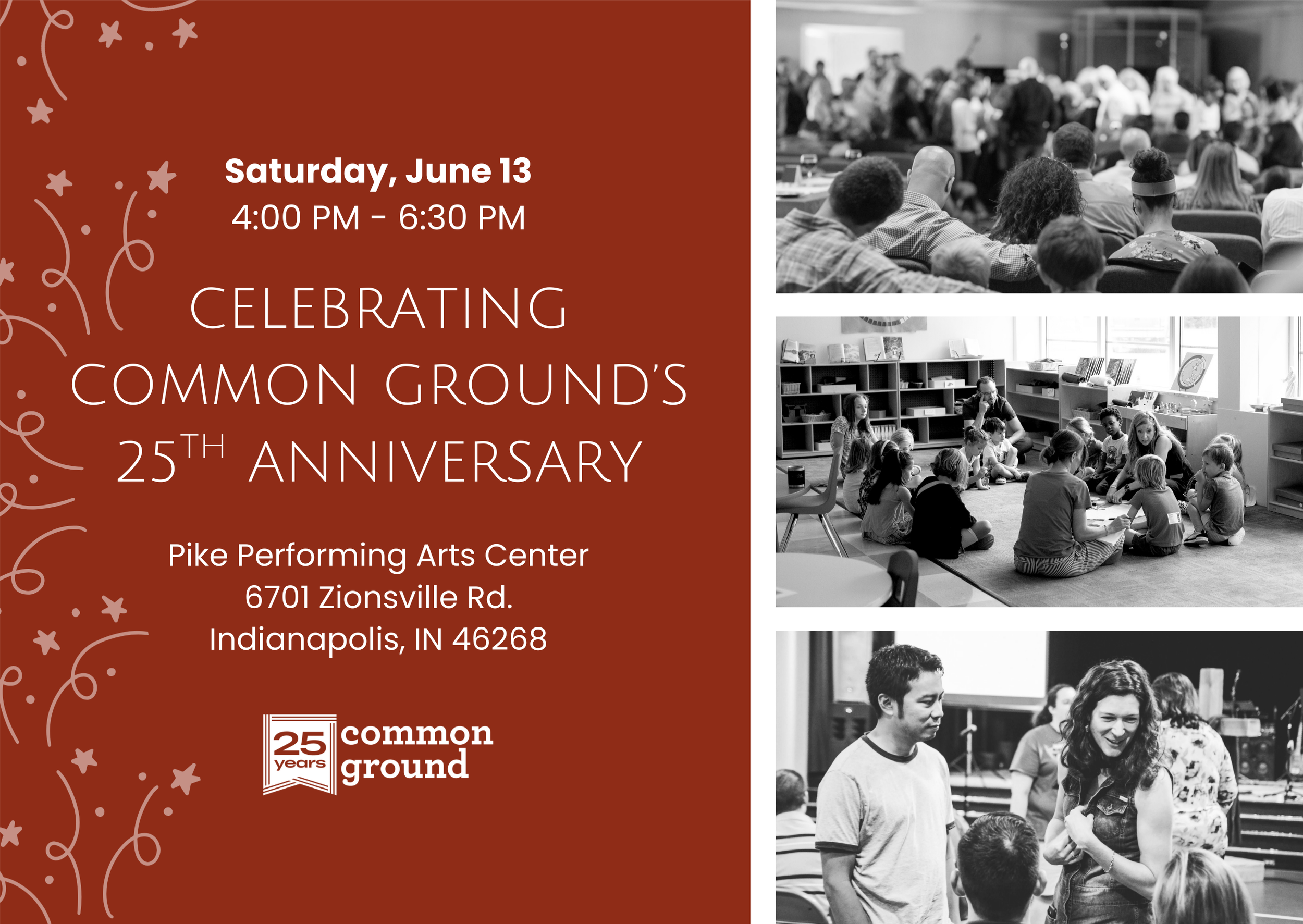 Before the program begins, enjoy time to reconnect in the lobby and outdoor spaces, share memories, and meet others who have been part of the Common Ground story over the years.